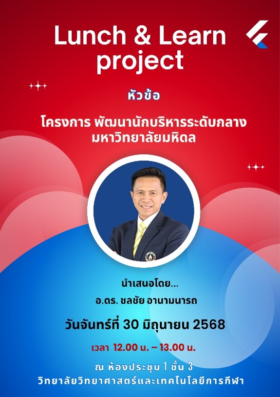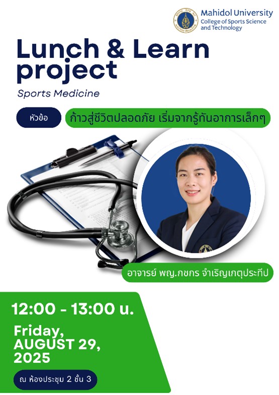 กิจกรรม Share & Learn ของวิทยาลัยวิทยาศาสตร์และเทคโนโลยีการกีฬา มหาวิทยาลัยมหิดล เพื่อเป็นเวทีแลกเปลี่ยนเรียนรู้ การถ่ายทอดประสบการณ์ในการทำงาน และแนวปฏิบัติที่ดี ของบุคลากรในวิทยาลัยฯ สำหรับ EP 5 ผู้ที่จะมาแชร์ประสบการณ์ คือ